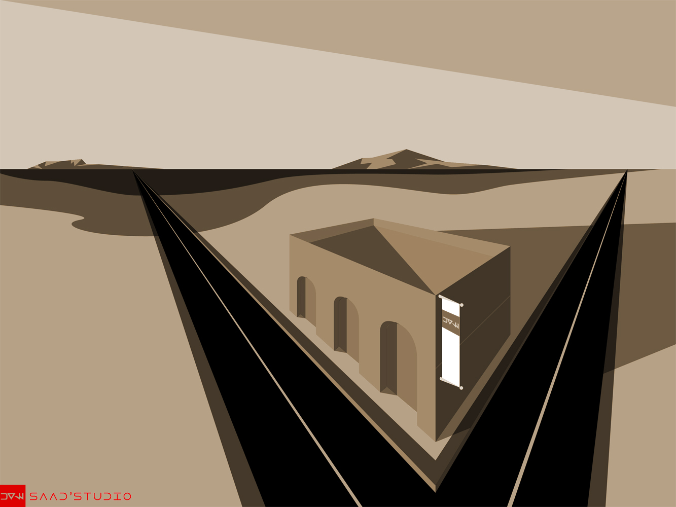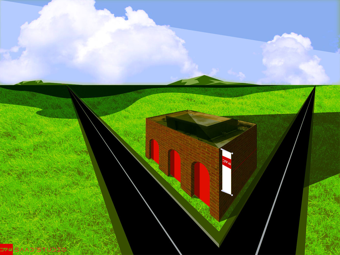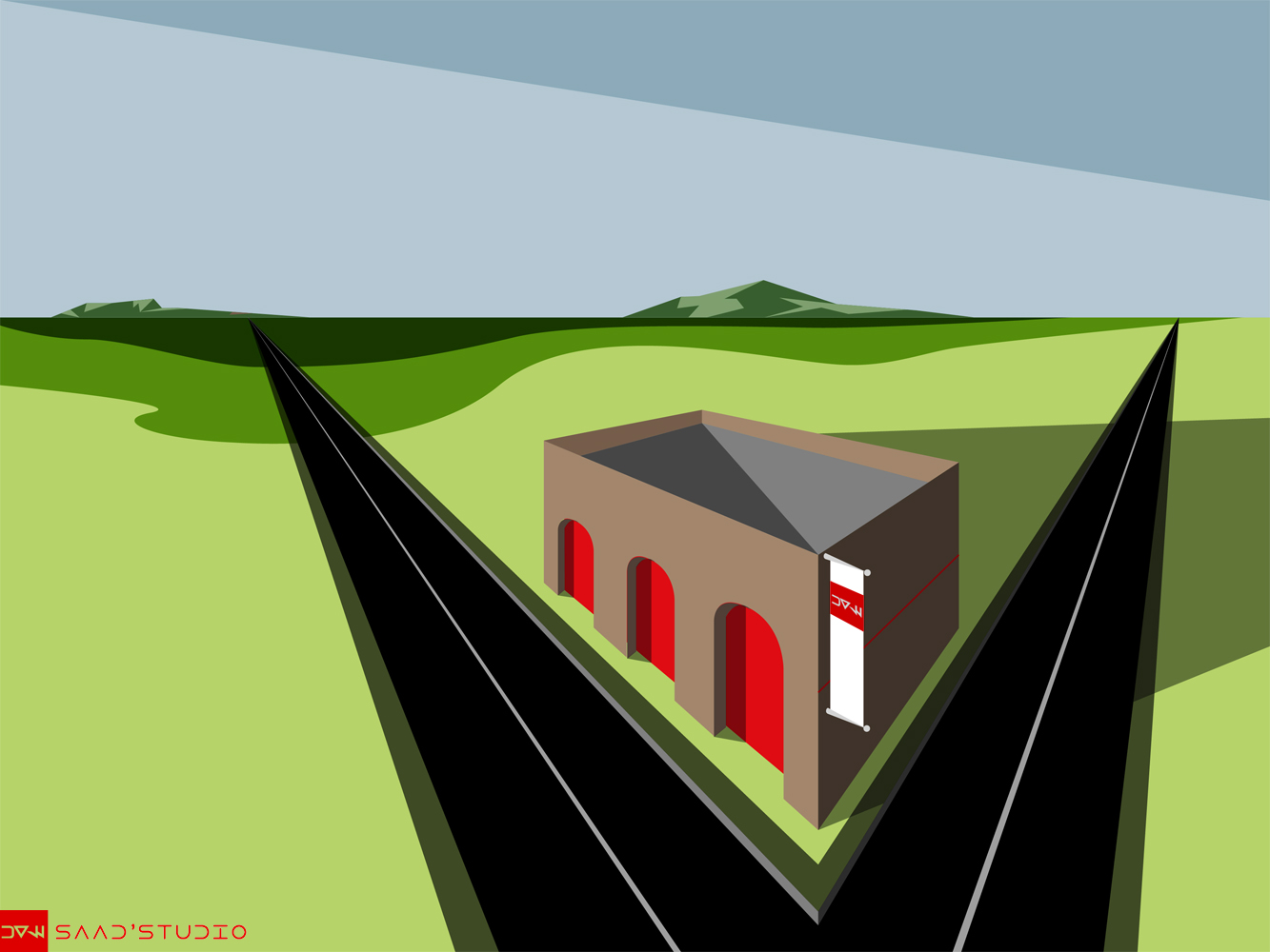 An illustration of a small building in open field. Made with Adobe Illustrated and in one instance, colored with Photoshop.